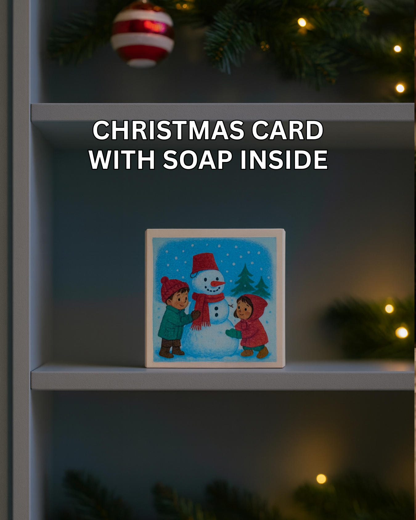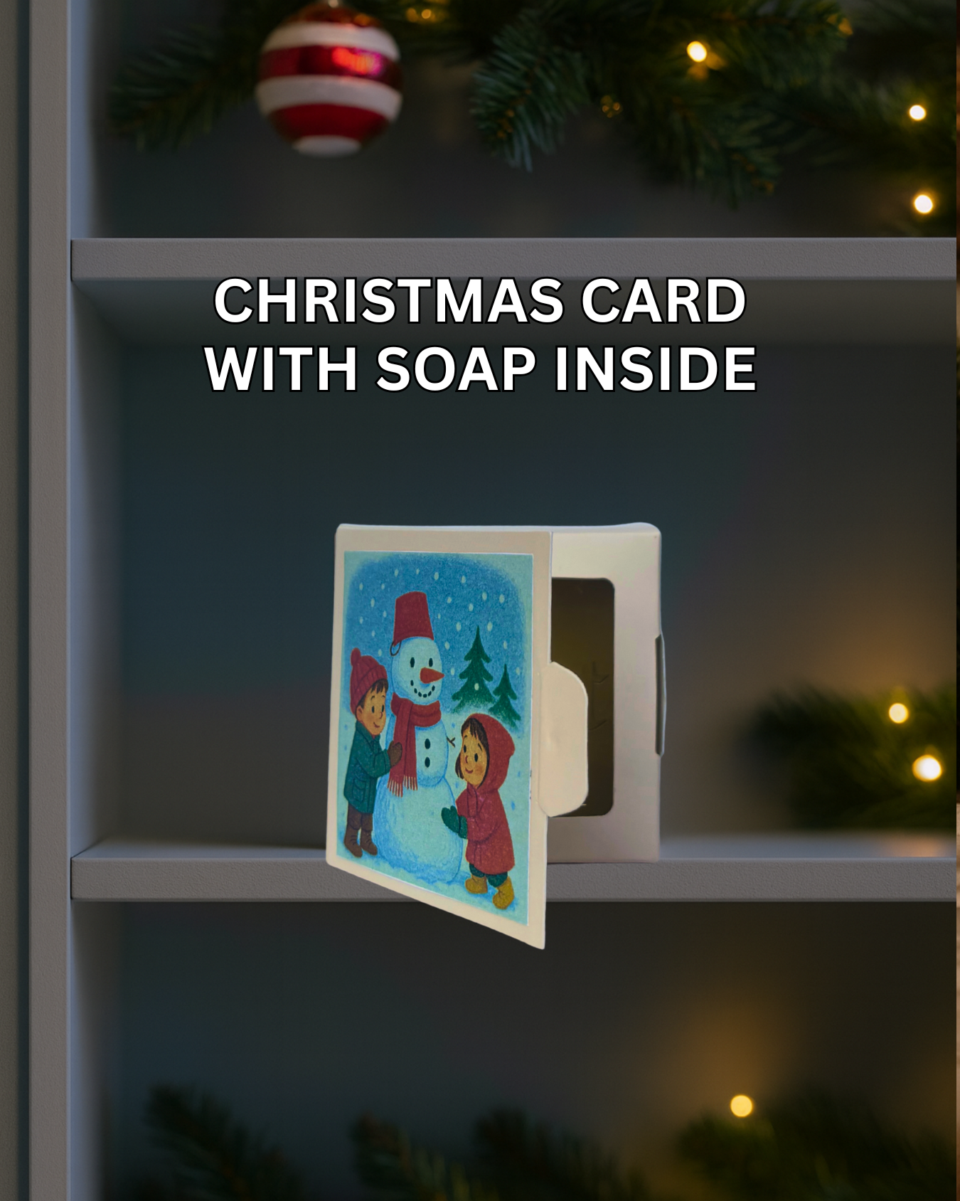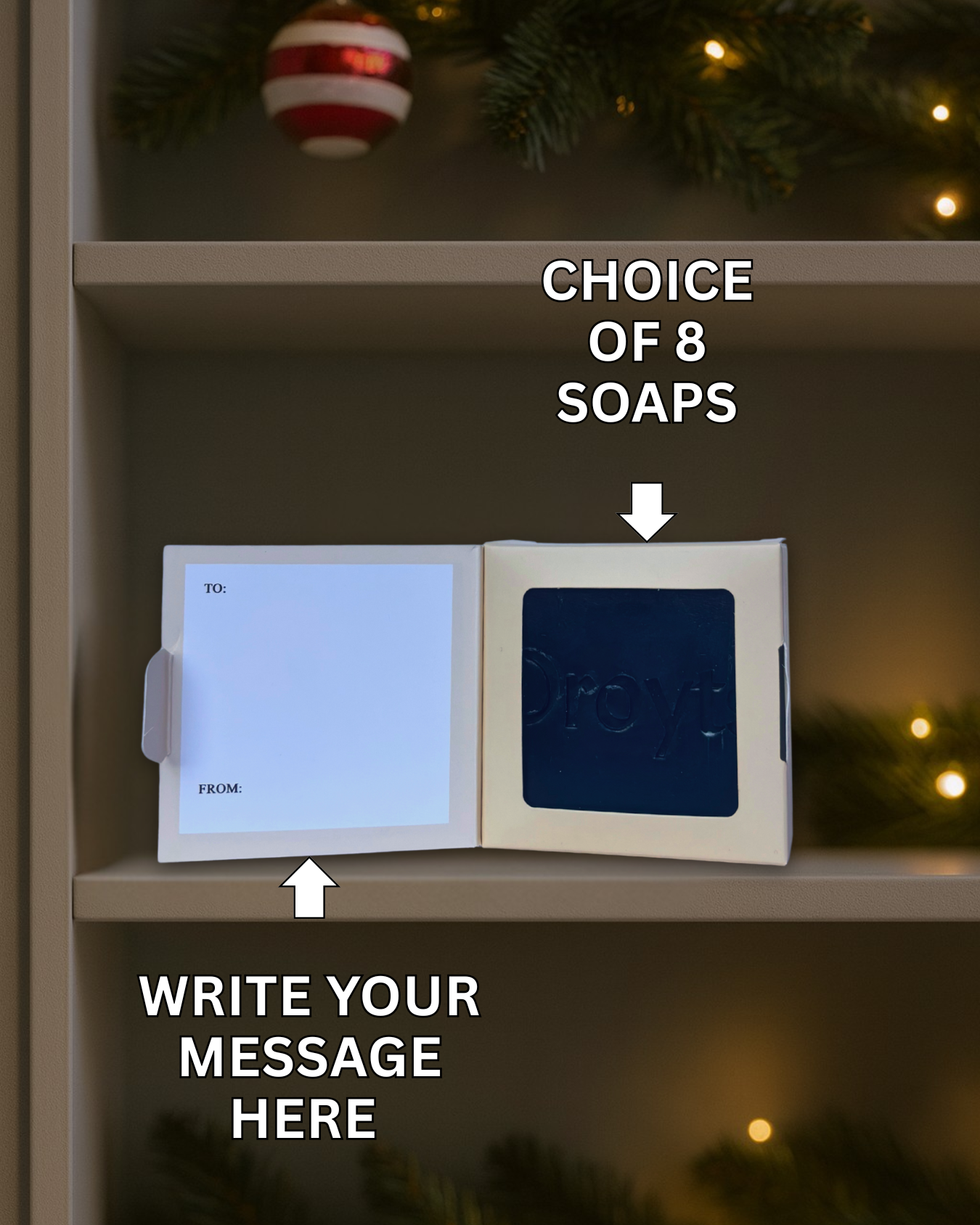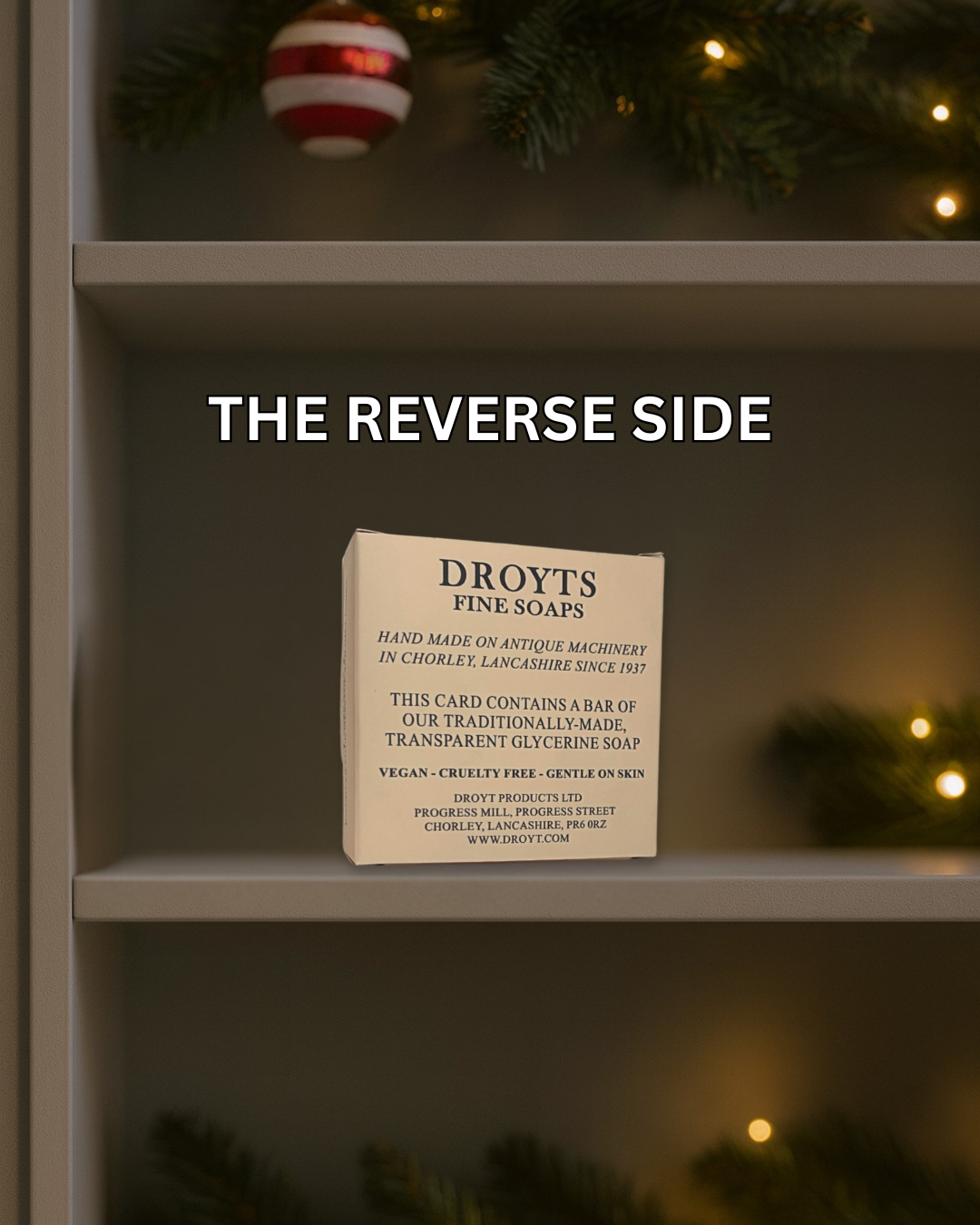 Our Christmas Card Soap Gift combines the charm of a festive greeting with the pleasure of a handmade Droyt’s soap. Each card opens to reveal a full-sized bar of our traditional transparent glycerine soap — crafted on our hand-powered antique machinery in Chorley, Lancashire.
