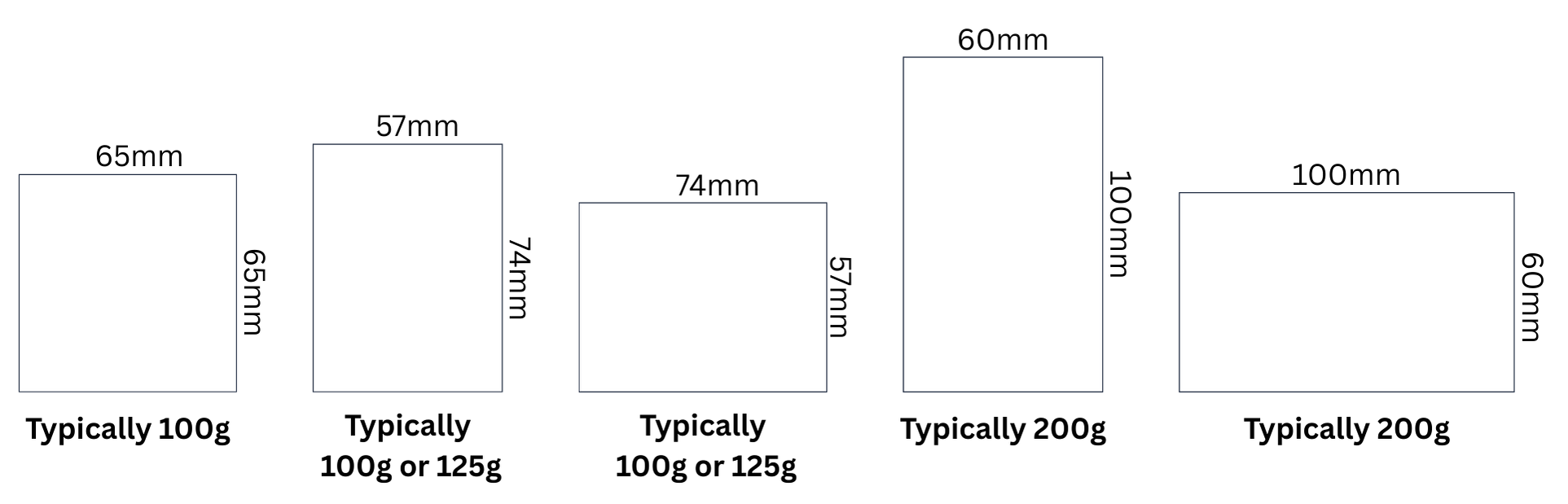 Standard sizes include 100g, 125g, and 200g bars, with bespoke options available on request.